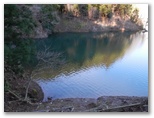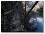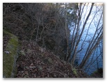村道は、7号橋のすぐ先で終わっていました。その先がどうなっているか、行って見たのですが、5分も行かぬうちに、歩いて行けない入り江のあることが分かりました。7号橋の道標まで戻ります。山道に進み、少し登ると道が水平になり、その入り江を高巻くことができました。この辺の道は歩きやすく整備されているようです。次の大きめの入り江に向かって下る部分では、鉄パイプの手すりがありました。こちらは青緑色の水の澄んだ、きれいな入り江です。