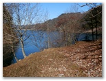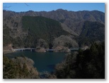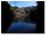 きれいな入り江の最奥部まで行ってみると、宮ヶ瀬湖対岸に緑色の半月橋が架かり、その向こうに仏果山の稜線が見えました。この入り江の左右は山が壁のように突き出て、奥まった隠れ家のような感じがあります。目障りなゴミや倒木もありません。入り江の奥の小沢からは清流が流れ込み、少人数でピクニックをするには素敵な入り江です。ただ、人にあまり知られない方が、きれいなままでいられるかも知れません。