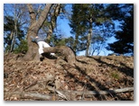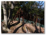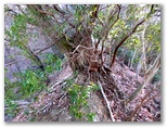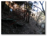 10号橋へは、この小ピークから北に延びる尾根を降りる計画です。ところが尾根すじの真ん中を鹿柵が走っているので、その右側か、左側か、どちらを歩けばよいのか分かりません。でもがっちり固定された脚立があるのだし、柵の下部には人の通れそうな破れ目もあるので、柵の向こう側に可能性がありそうです。脚立に上り、柵を越えました。これで、鹿柵の左側を下ることになります。実際に下って行くと、鹿柵を越えられる破損箇所が途中に2か所ありました。