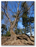 10号橋を発ってから、道草を食いながら1時間30分、ようやく617m峰に到着しました。きょう第二の目的地です。さっそく“天然のベンチ”に腰を下ろしました。これは生きた木です。山頂の真ん中にある三角点石の上にデジカメを置いて、セルフタイマー撮影をしました。遠くの丹沢に露出を合わせたのが、上の写真です。風があって、立ち止まるとやや寒かったので、陽だまりに行ってお茶とお菓子の時間にしました。