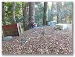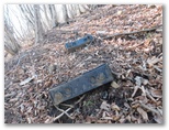 幸いその踏み跡は、まずまず道形を成していました。しかもピンクテープが次々と現れます。難なく廃屋の手前まで登ってきました。冷蔵庫、洗濯機、耕耘機、その他、粗大ゴミが放置されています。南面が開け、セーメーバンの東尾根と思われる稜線を望めました。紅葉したモミジがあり、折しも届き始めた太陽光を受け、真っ赤に燃えています。ここで一息つきました。この先はひたすら尾根すじを辿る道です。と思ったら、ピンクテープが楽な道に誘導してくれました。
