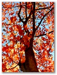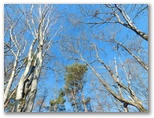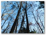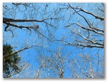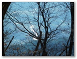 大月市の道標に「宮路山」と書かれています。読みは「みやじやま」でしょう。「宮地山」なら「みやちやま」とも「みやじやま」とも読めます。名称の正統性はさておき、いずれも意味のある名だと思います。ここでリュックを下ろし、熱い紅茶とお菓子で休憩しました。広々として、本当に気持ちの良い場所。撮影すべき風景も特にないので、三方の空を撮りました。真っ青な大空へと伸び上がる木々、枝々。平凡であっても、今ここにいる自分が目にする印象的風景です。