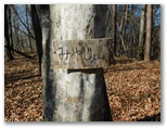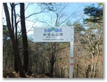 次の1060m峰も越えて行くと、樹形の整った樅の木が立っていました。挨拶のタッチをします。そのすぐ先の送電鉄塔は、深城(ふかしろ)線18号。その先の短い急登区間に、崩れたプラ階段がありました。これを辿って登ると、まともな登山道と出合い、「大岱山/セーメーバン/宮路山」を指す道標が立っていました。ここから大岱山まで往復します。落ち葉の積もった明るい斜面をサクサク登っていくと、直ぐに大岱山でした。大月市の山頂標は「垈」ではなく「岱」です。