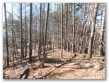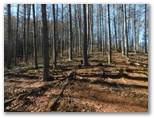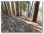 宮地山では小休止のつもりが、ついつい長引いてしまいました。発つ前に、倒木の上にカメラを置いて自分撮り:成功。次の大岱山に向かいます。引き続き広い尾根を西へと進むと、落葉樹に代わって、カラマツとアカマツの林になりました。相変わらず明るく、開放感があることに変わりありません。ショウジ峠は、うっかり通り過ぎました。行く手に1070m峰が見えてきます。道はその南側を巻いていました。地理院地図の破線とは異なります。この辺りは勘で進みました。