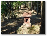 その急登を一歩一歩こなして、いつしか最後の詰めに入っていました。ここが最大の頑張りどころです。ところが、手で掴めるものが乏しい上に、堆積した落ち葉で思うようにステップを刻めず、足場を確保できません。そこで、右手の針葉樹林との境目を登ることにしました。普通なら障碍物となる根っこや倒木が、ありがたいお助けになります。やがて急登の終点が見えてくると元気が増し、一踏ん張りで登り切りました。「山神大権現」の石碑と馬の置物があります。