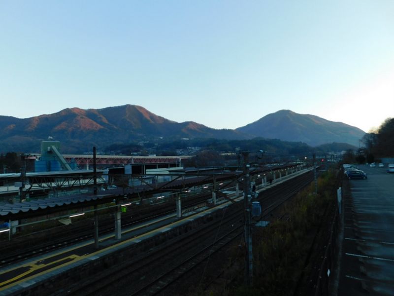 -- 猿橋駅南口より、百蔵山(左)と扇山。6:51