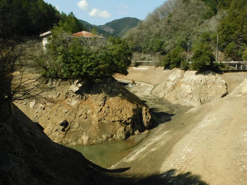 -- 耐震工事のため、水が抜かれた鎌北湖。10:58