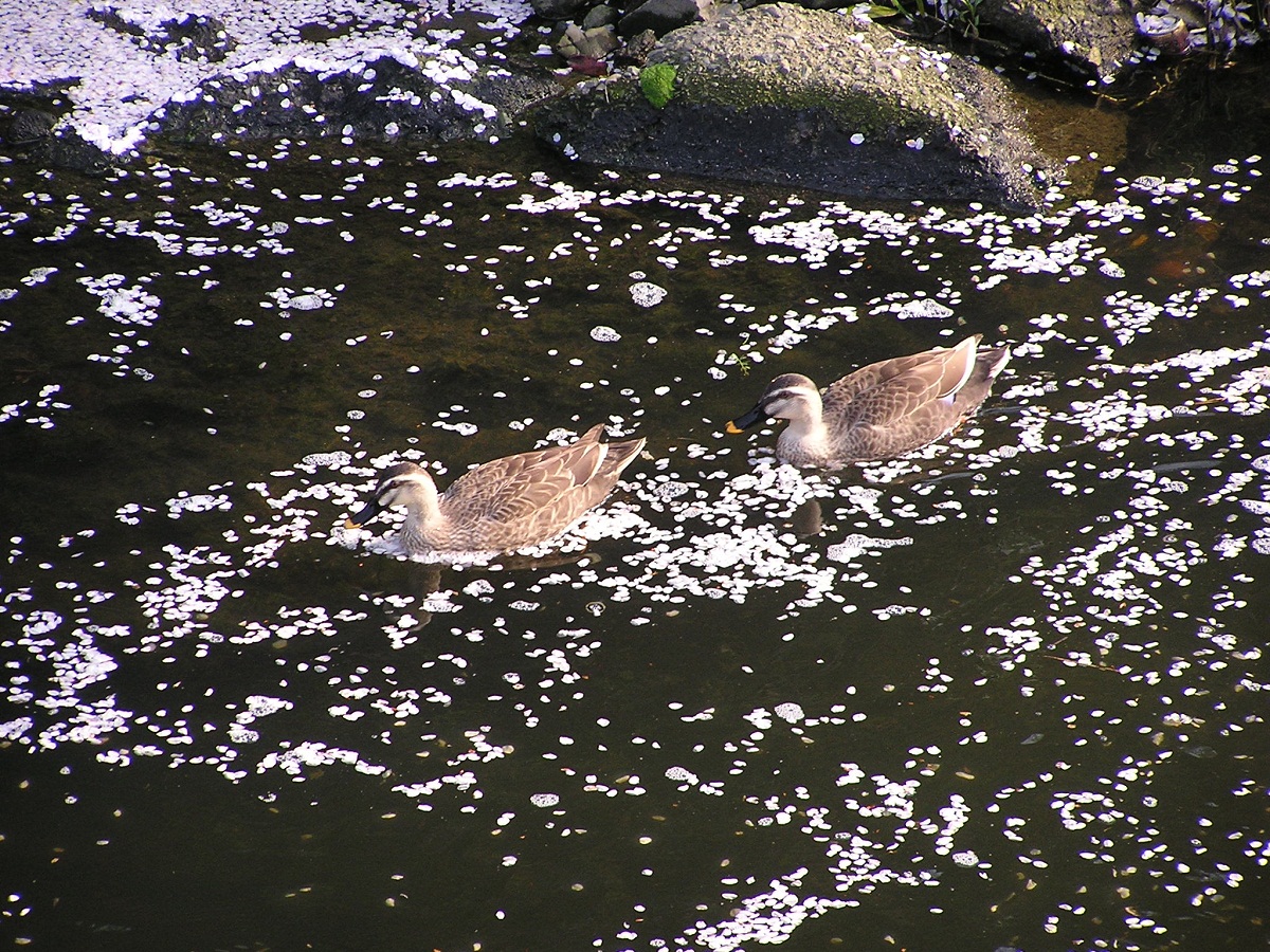 (下・右:)このすぐ下を流れる恩田川にて、花筏に遊ぶ夫婦鴨。(2010年4月8日撮影)