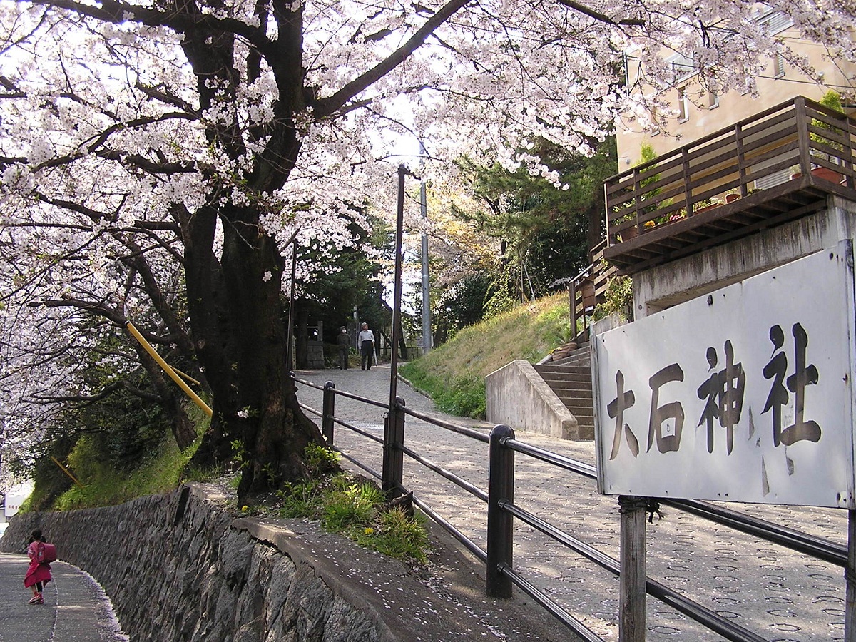 (下・右:)大石神社の桜の季節は、正面の石段よりも、こちらのスロープがお勧め。