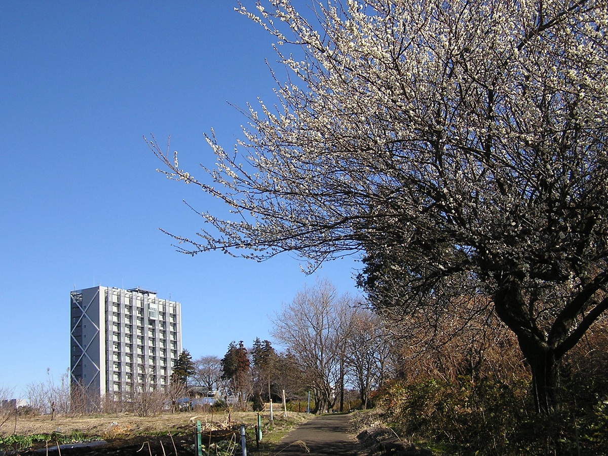 (下・左:)高尾山。背後に東工大の校舎が建っている。この校舎に上ると、眺望がさらに素晴らしいという。(両方とも2011年3月4日撮影)