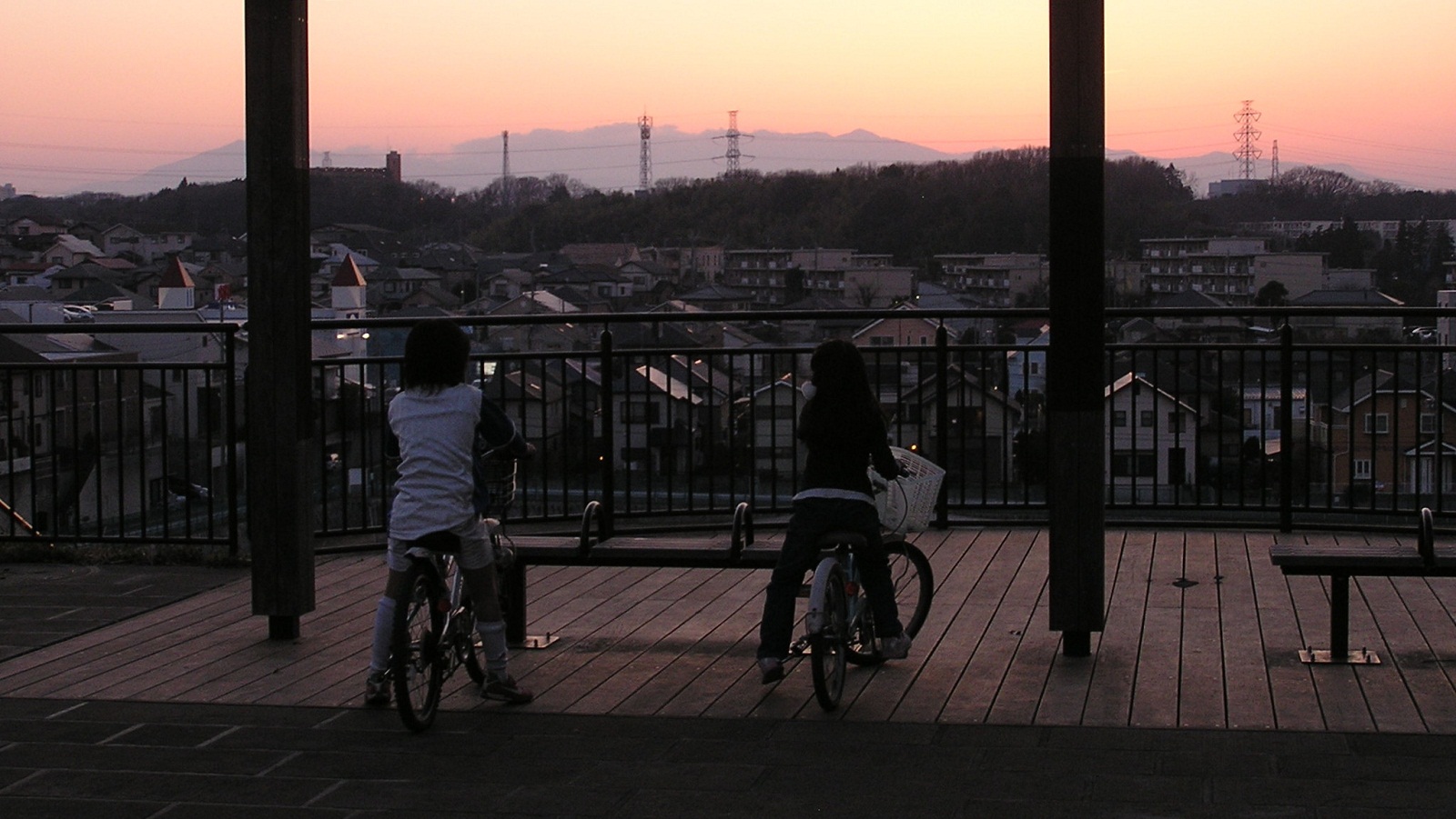 (下・左:)長津田みなみ台公園から夕日を見つめる子供たち。(2011年3月13日撮影)