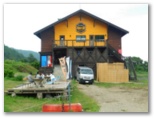 和田小屋に到着し、受付に行くと、食事は「魚沼産コシヒカリ」使用と書かれていました。この表示は義務化されているそうです。2階の寝室に案内されると、蚕棚式の二段造りではなく、天井の見えるゆったりした空間。お風呂があり、男性は5時からというので、それまで小屋周辺の花や虫を撮影しに出ました。ここは苗場山五合目。若草色をしたゲレンデを見上げると、神楽ヶ峰の方向に上るリフトの柱が、点々と列をなしています。苗場山は神楽ヶ峰に隠され、見えません。
