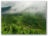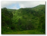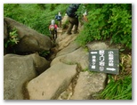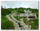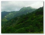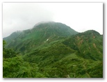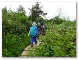 翌朝は、まずまずの晴天でした。雲が多そうですが、問題ありません。中学校の生物部のグループが、朝食と昼食の弁当を受け取って、早々と出て行きました。国立公園内で植物採集をするのだそうですが、特別な許可を受けているのでしょう。私たちは6時から朝食をいただき、6時半に出発しました。登山道はゲレンデ尾根の北面にあります。多くの山行記に書かれている通り、岩石がゴロゴロして歩きにくい道でした。濡れた岩も多いので、滑らないように注意が必要です。