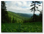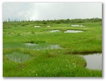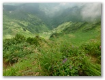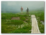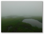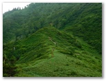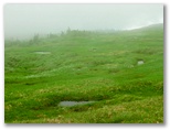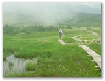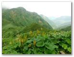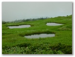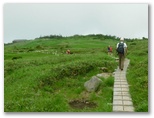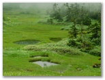 次に、小赤沢方面の道に入ってみました。湿原は大らかに南方へと広がり、緑色の何とも優しい風景です。山麓からここに至る道が決して易しいとは言えなかったことを思うと、正に別世界。苗場山が火山であることを忘れてしまいそうです。この風景がいつまでも存続して欲しいと思いますが、すべて形あるものには限りがあるのが常。大噴火が起これば、一たまりもなく姿を変えてしまうかも知れません。でもその先には、また新しい奇跡が生ずるのかも....