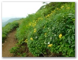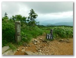 中ノ芝(1880m)の休憩所あたりから、ニッコウキスゲが見られるようになりました。周辺は、ワタスゲ、イワイチョウ、キンコウカなどがいっぱい。断続的に木段が設置され、登山道の荒れを最小限に抑え、植生を保護しています。多くの人が歩く ⇒ 草が生えなくなる ⇒ 雨や雪で土が流される ⇒ 岩石が露出する(荒れる)ということなのでしょう。雲が多く、遠望は利きません。上信越の名山を見られないのは残念ですが、樹木が減って、森林限界に近い開放感があります。