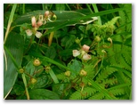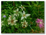 和田小屋(1370m)から1時間弱で、下ノ芝(1680m)の休憩所に着きました。早くも大汗を書いています。汗がぐっしょり浸み込んだ下着を脱ぐと、蝶がやって来て汗を吸い始めました。私もスポーツドリンクを飲みます。暑い上に湿度も高くて大変ですが、キンコウカ、ゴゼンタチバナ、ほか色々の花に慰められます。ここでこんなに多くの花があるのなら、「お花畑」ではどれほど咲いているだろうかと、楽しみです。これ以降、上はシャツ1枚だけで歩きました。