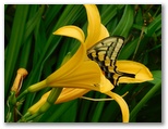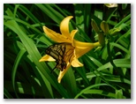 山頂標と一等三角点のある山頂は、すぐでした。展望はありません。いつの間にか、夏の明るい日差しが満ちて、真新しいニッコウキスゲの黄色の花と、その花に潜り込んだキアゲハとを際立たせています。花にとって蝶は蜜泥棒だとも言われますが、ニッコウキスゲの花粉はキアゲハの体にしっかりと付くことでしょう。私たちは、湿原を見渡せる休憩所まで戻り、お昼にしました。先ほどから、小さな晴れ間が出たり、消えたりして、湿原の色々な表情を見せています。