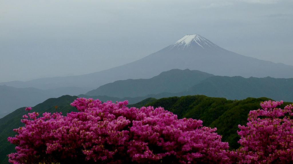 -- 墨絵の富士を背景に、鮮やかトウゴクミツバツツジ。5:32