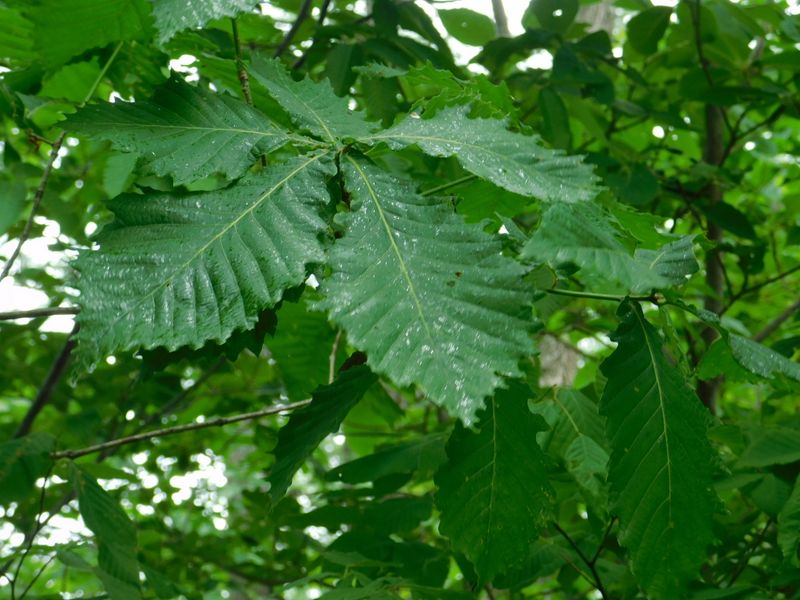 -- 雨でもないのに、濡れたミズナラの葉。ブレあり。11:33