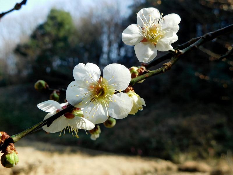 -- 手を伸ばして白梅。メジロがキリキリと鳴いていた。