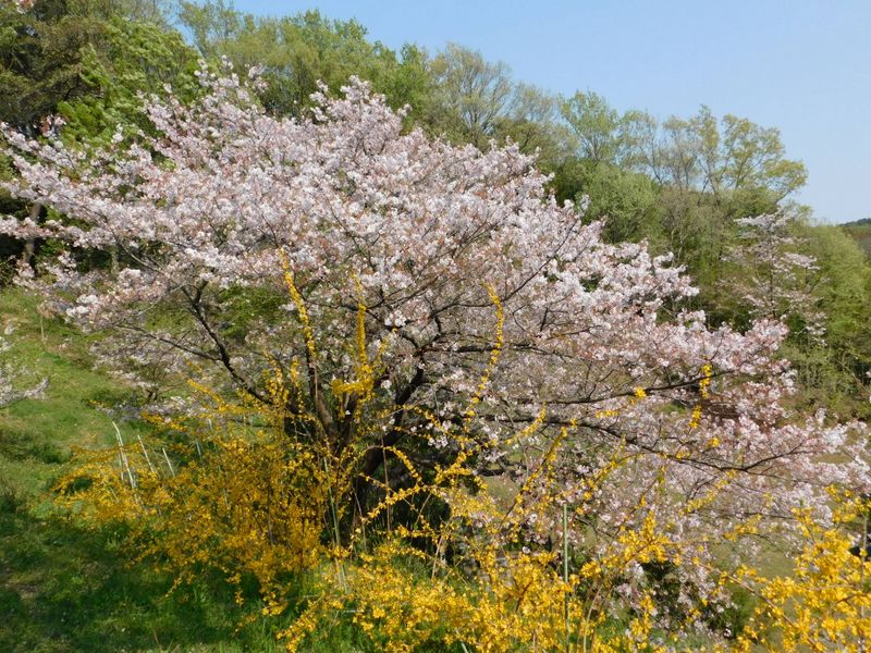 ソメイヨシノとレンギョウ。