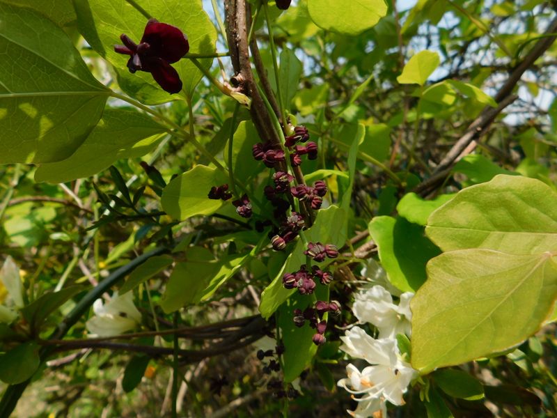 -- アケビの雌花(上) + 雄花 + 白ツツジ。