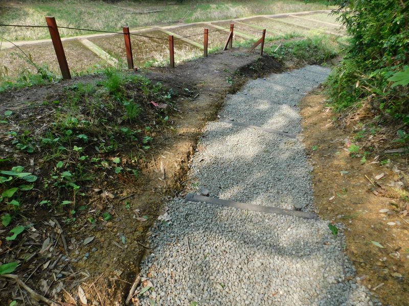 -- 砂利が敷かれた山道(下り)。