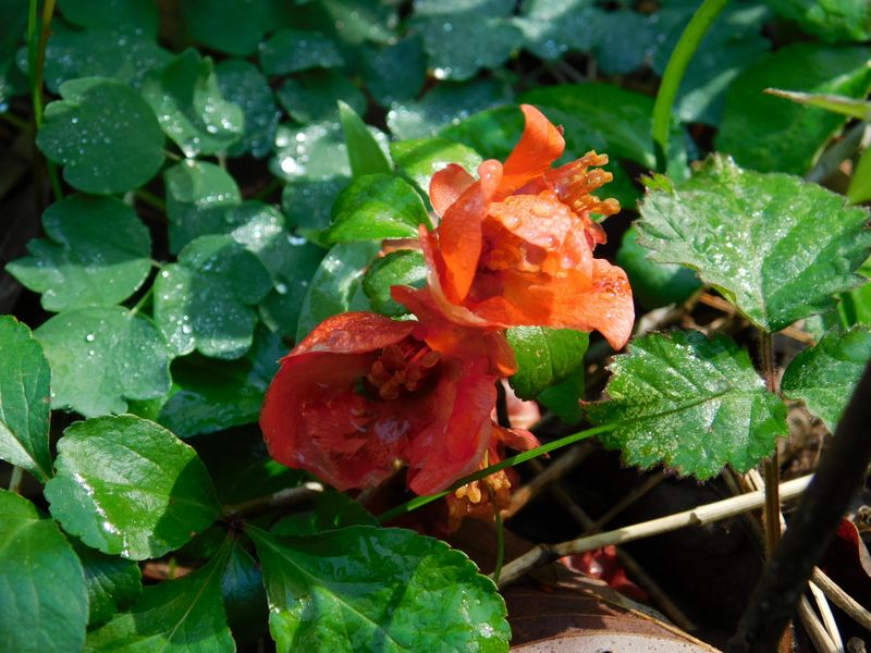 -- まだ濡れていた、クサボケ。