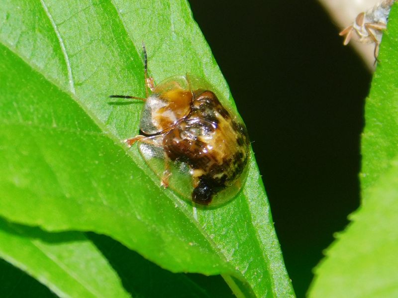 -- イチモンジカメノコハムシ。右はムシヒキアブか?