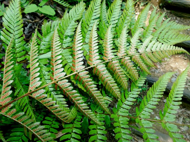 -- ベニシダの裏の赤い胞子嚢と表(奥)。