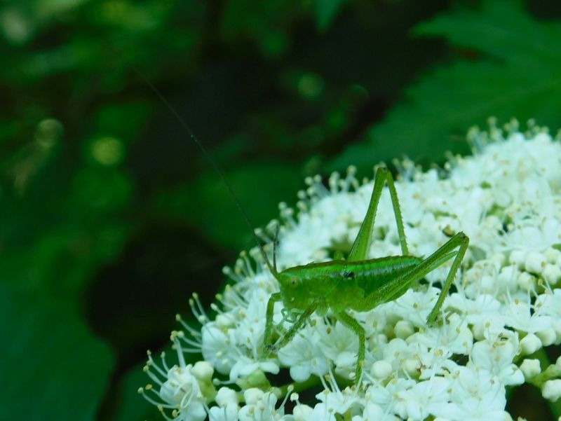 -- 触角の長いヤブキリ♀幼虫@ガマズミの花