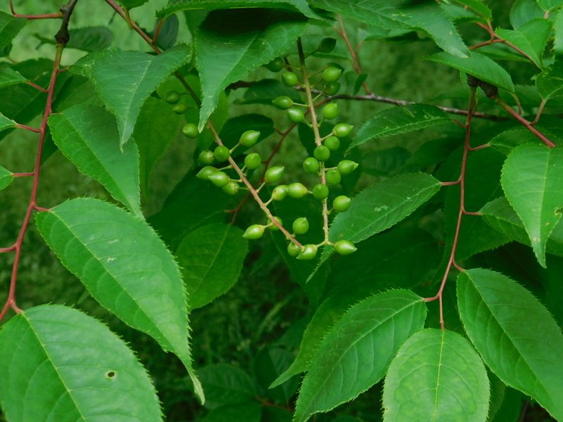 -- ウワミズザクラの果実はまだ緑色。