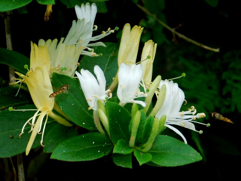 -- スイカズラの花とホソヒラタアブ。