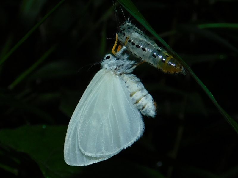 -- キアシドクガ♀。腹部が大きく、さなぎも大きい。