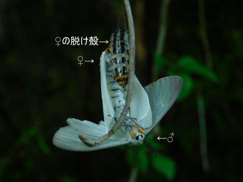 -- 羽化したての♀と交尾するキアシドクガ♂。