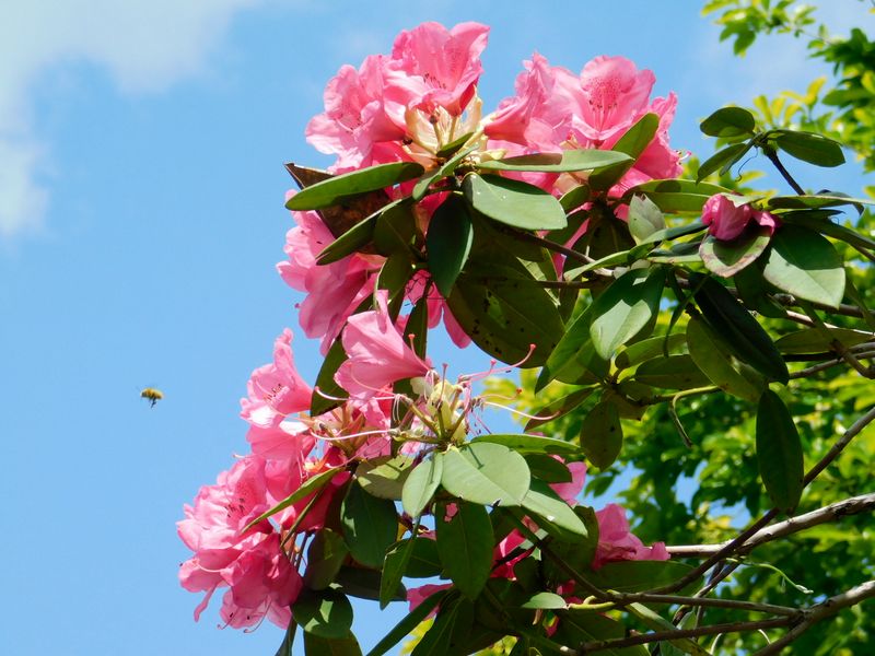 -- 青い空、白い雲、ピンクのシャクナゲ。