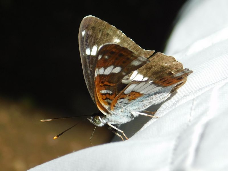 -- イチモンジチョウがズボンにとまった。