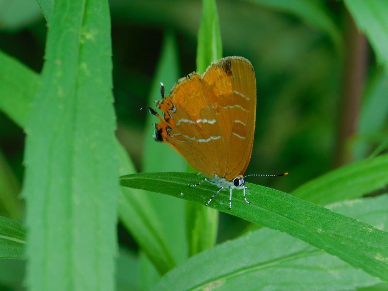 -- アカシジミ。右翅の欠損部から左翅の表が見える。