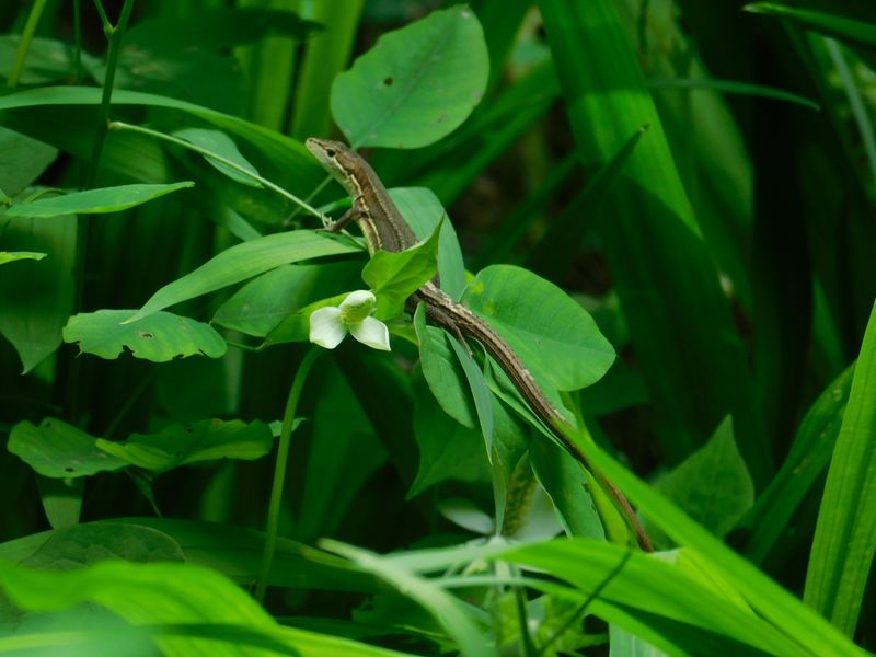 -- 草から草へと渡り歩く、ニホンカナヘビ。