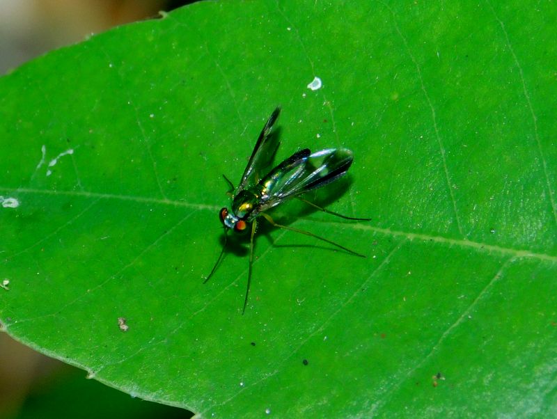 -- マダラホソアシナガバエ、体長約5〜6mm。