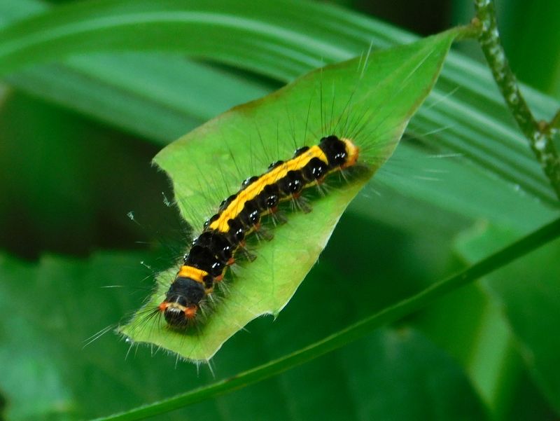 -- ヒメシロモンドクガの幼虫。手前が頭。