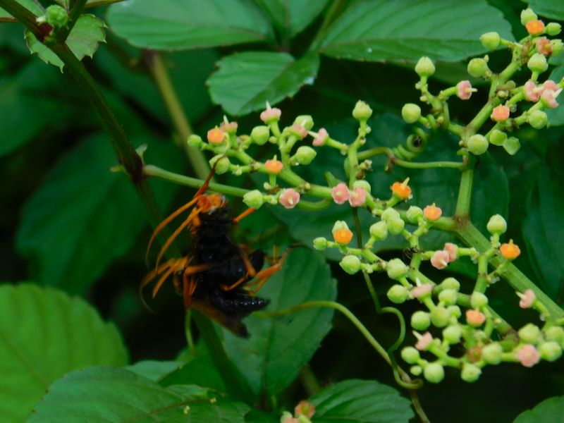 -- 突然ベッコウクモバチ♂が♀に抱き着き、♀が暴れる。