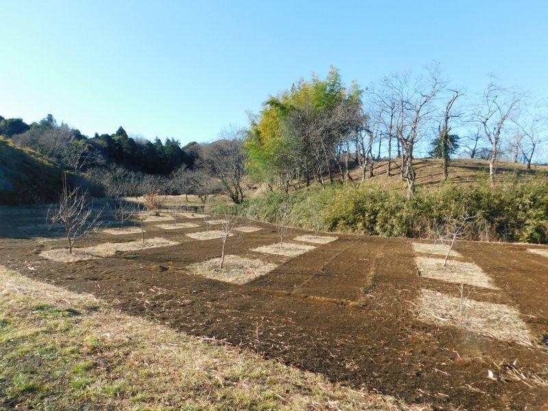-- 果樹園のパッチワーク。緑色は竹林と笹薮。