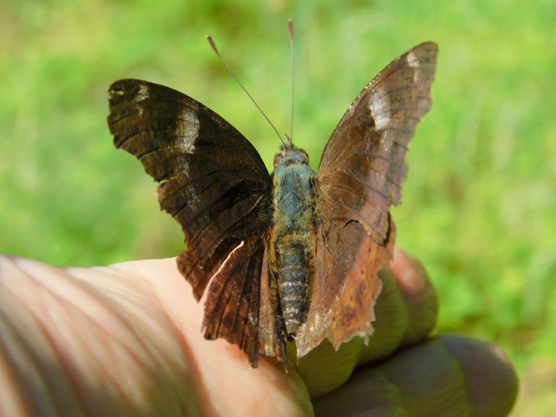 -- 青い鱗粉の落ちたルリタテハ:飛ぶ力は強い。