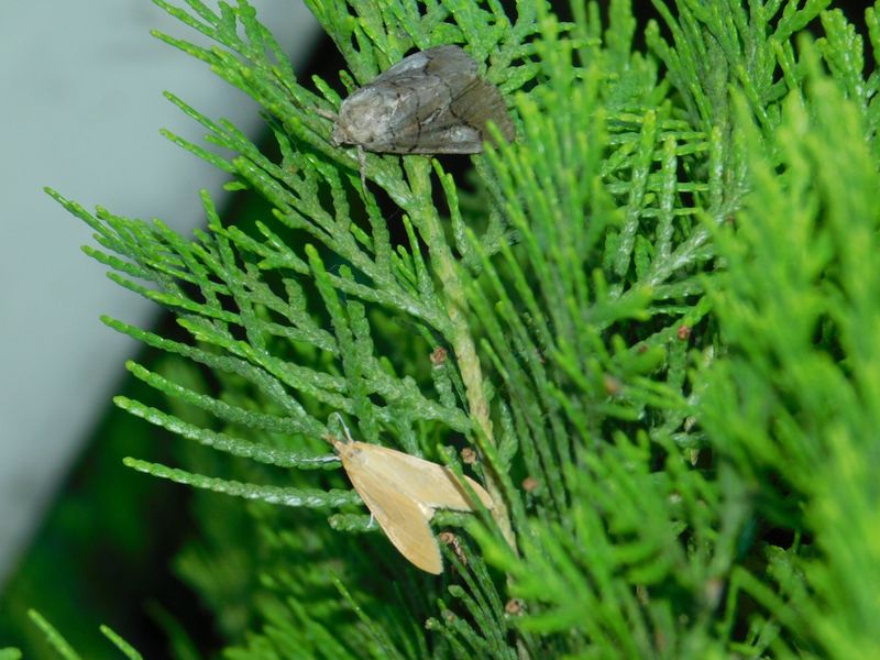 -- フタスジヨトウ(上)とキベリハネボソノメイガ。
