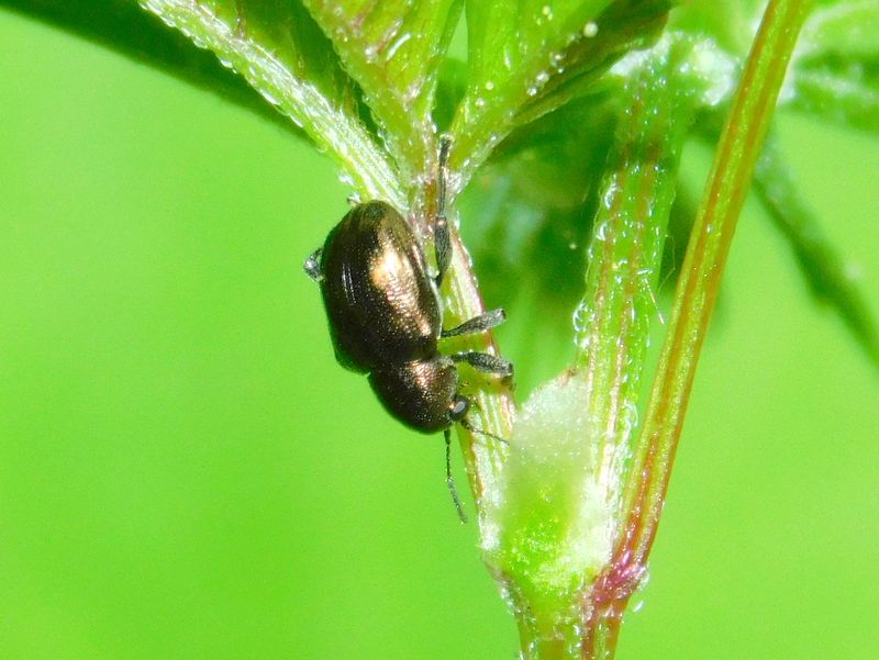 -- アオバネサルハムシ?全身が黒く、腿が太めだが。