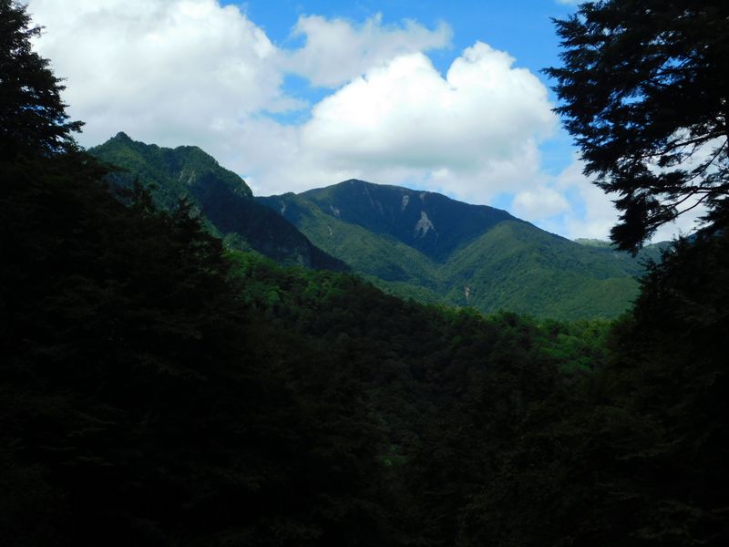 -- 沢ぐるみ沢より望む、鶏冠山(左)と木賊山。