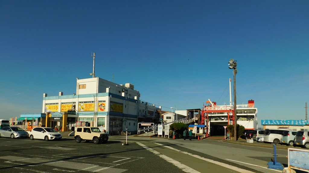 -- 左舷から下船し、左のビルから出て来た。9:04