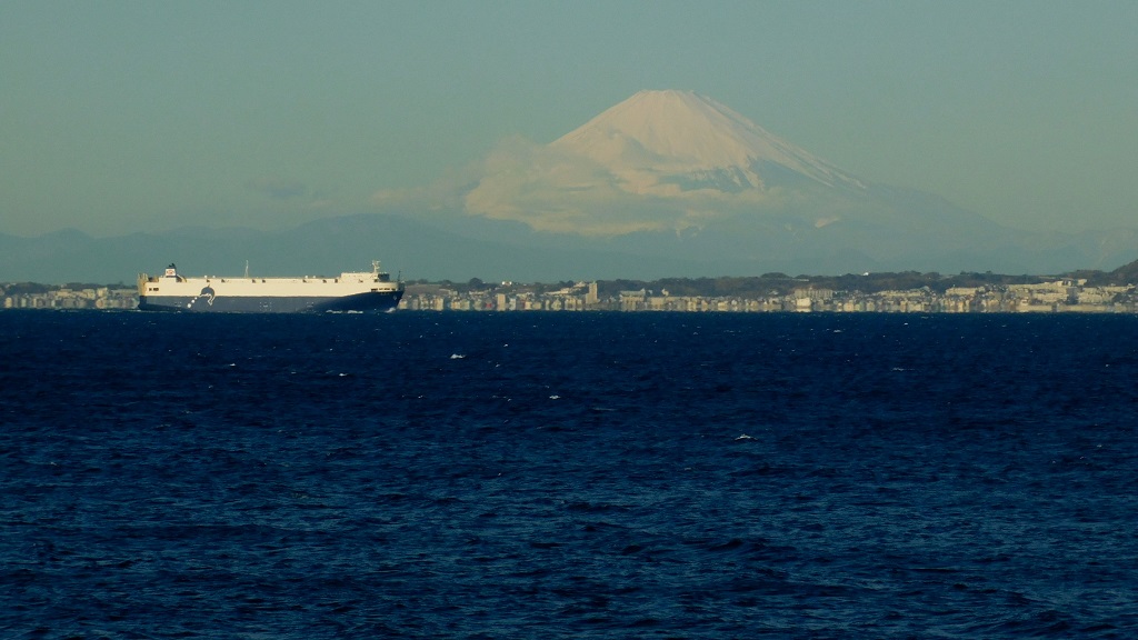 -- 東京湾にて、大きな船と大きな富士山にズームイン。8:52