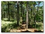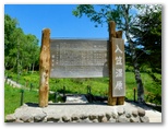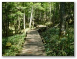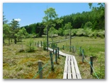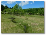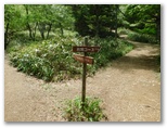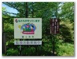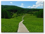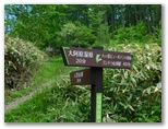 鳳凰三山、甲斐駒、仙丈ヶ岳を見たかったのですが、雲が離れそうもなかったので、早めに山頂を辞し、大阿原湿原に向かいました。15分ほどで、林道に下り立ちます。道標を見て「首切登山道」を下りて来たことを知りました。よくできた道標で、すずらんのイラスト、きれいな書体、自然と調和するデザインで、ハイキングコースの各要所に立っています。さらに林道をテクテク15分ほどで、大阿原湿原に到着しました。周回コース30分と書いてあります。